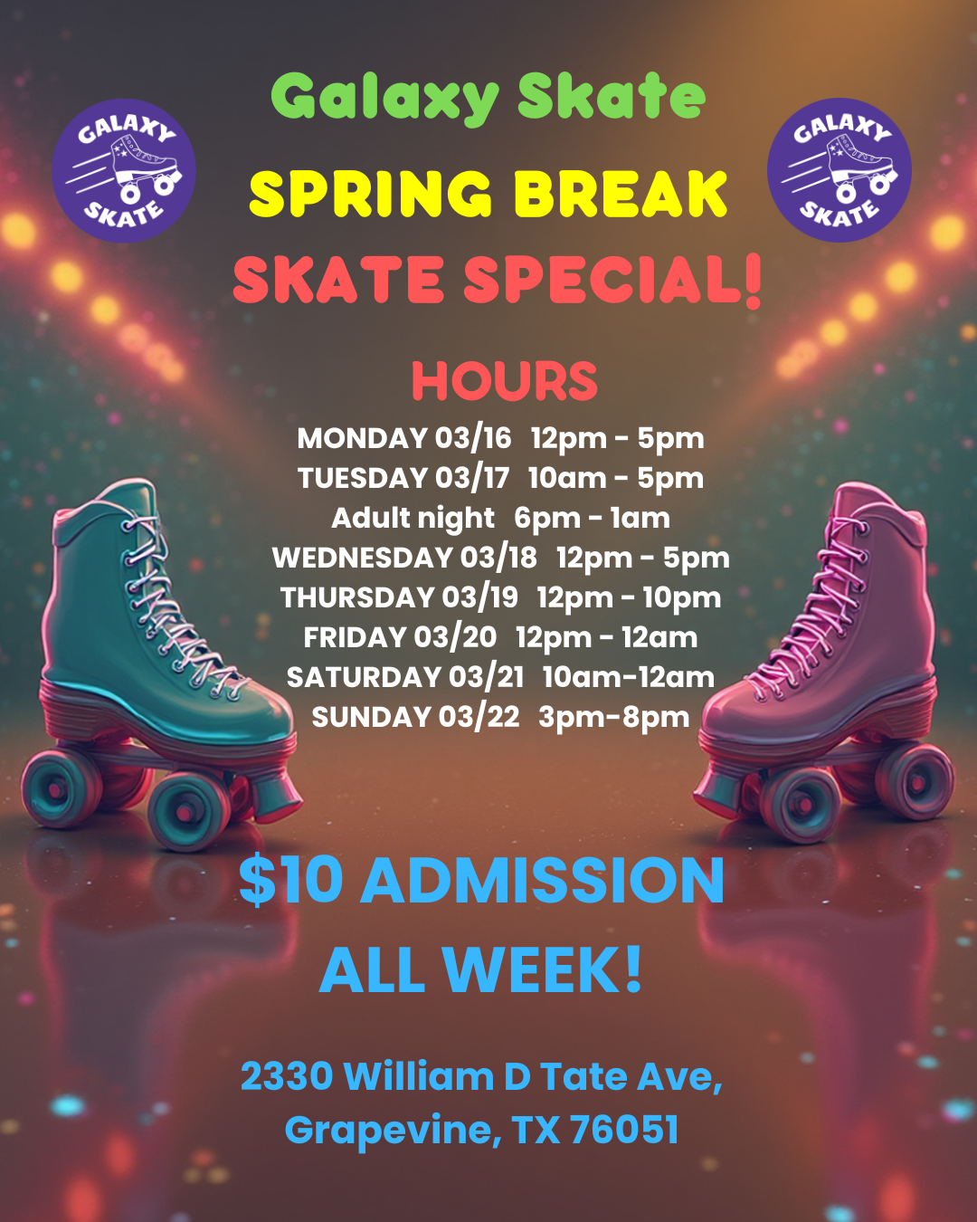 Located north west of the DFW airport, Galaxy Skate Grapevine offers a safe and welcoming environment for people of all ages and skill levels to enjoy the timeless joy of roller skating.